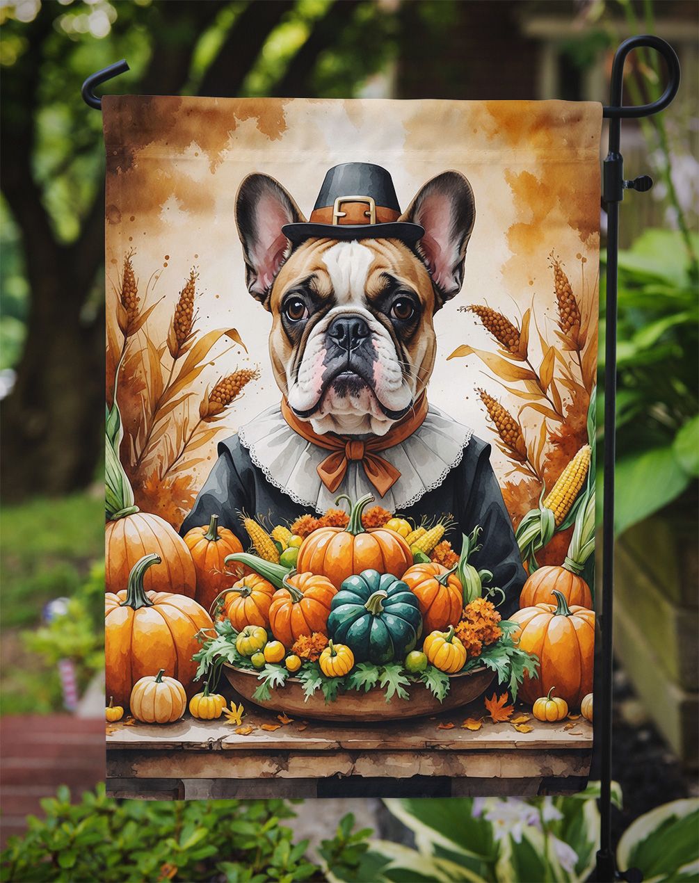 Garden Flag featuring breed specific French Bulldog artwork. Celebrate Thanksgiving with this Thanksgiving Garden Flag. Enhance the beauty of your garden, patio, or yard with Caroline's Treasures Decorative Garden Flag, proudly made in the USA. Crafted from two pieces of thick, double-sided polyester fabric, this 2-ply garden flag is designed to withstand various weather conditions, making it water-resistant and weatherproof. Featuring correctly readable words on both sides, this garden flag offers a delightful visual experience from any angle. With its heavier weight, it stands out among other garden flags, ensuring stability and durability even in wind, rain, and snow. Measuring approximately 11 1/4 inches by 15 1/2 inches, this flag allows you to personalize your outdoor decor. It comes with a 1 1/2-inch sleeve sewn in, allowing easy attachment to any standard garden flag stand or garden size porch hanger (sold separately). Make a statement in your outdoor space with Caroline's Treasures Decorative Garden Flag, a vibrant and high-quality flag that adds color and personality to your surroundings. Proudly made in the USA, it's a symbol of quality craftsmanship and attention to detail.