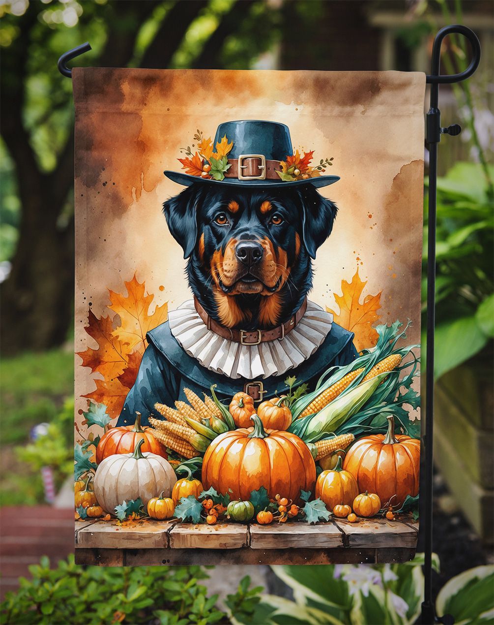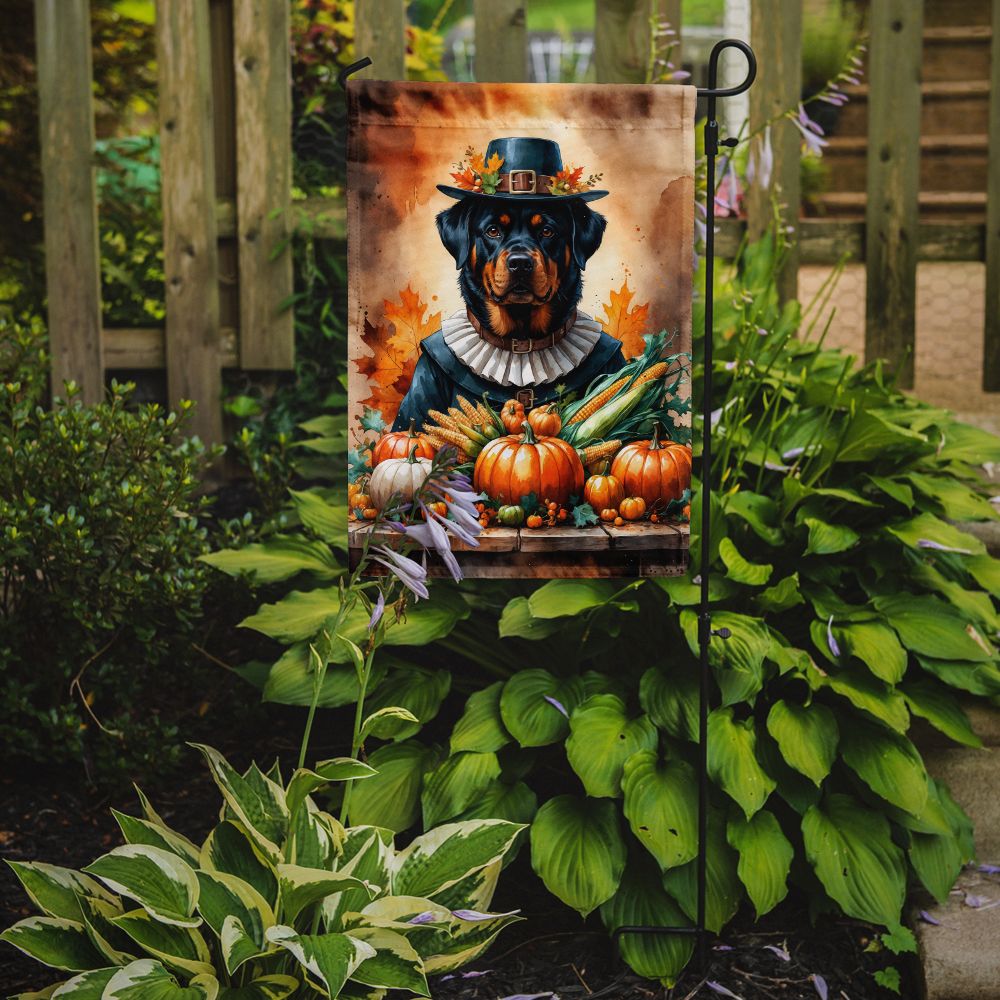 Garden Flag featuring breed specific Rottweiler artwork. Celebrate Thanksgiving with this Thanksgiving Garden Flag. Enhance the beauty of your garden, patio, or yard with Caroline's Treasures Decorative Garden Flag, proudly made in the USA. Crafted from two pieces of thick, double-sided polyester fabric, this 2-ply garden flag is designed to withstand various weather conditions, making it water-resistant and weatherproof. Featuring correctly readable words on both sides, this garden flag offers a delightful visual experience from any angle. With its heavier weight, it stands out among other garden flags, ensuring stability and durability even in wind, rain, and snow. Measuring approximately 11 1/4 inches by 15 1/2 inches, this flag allows you to personalize your outdoor decor. It comes with a 1 1/2-inch sleeve sewn in, allowing easy attachment to any standard garden flag stand or garden size porch hanger (sold separately). Make a statement in your outdoor space with Caroline's Treasures Decorative Garden Flag, a vibrant and high-quality flag that adds color and personality to your surroundings. Proudly made in the USA, it's a symbol of quality craftsmanship and attention to detail.